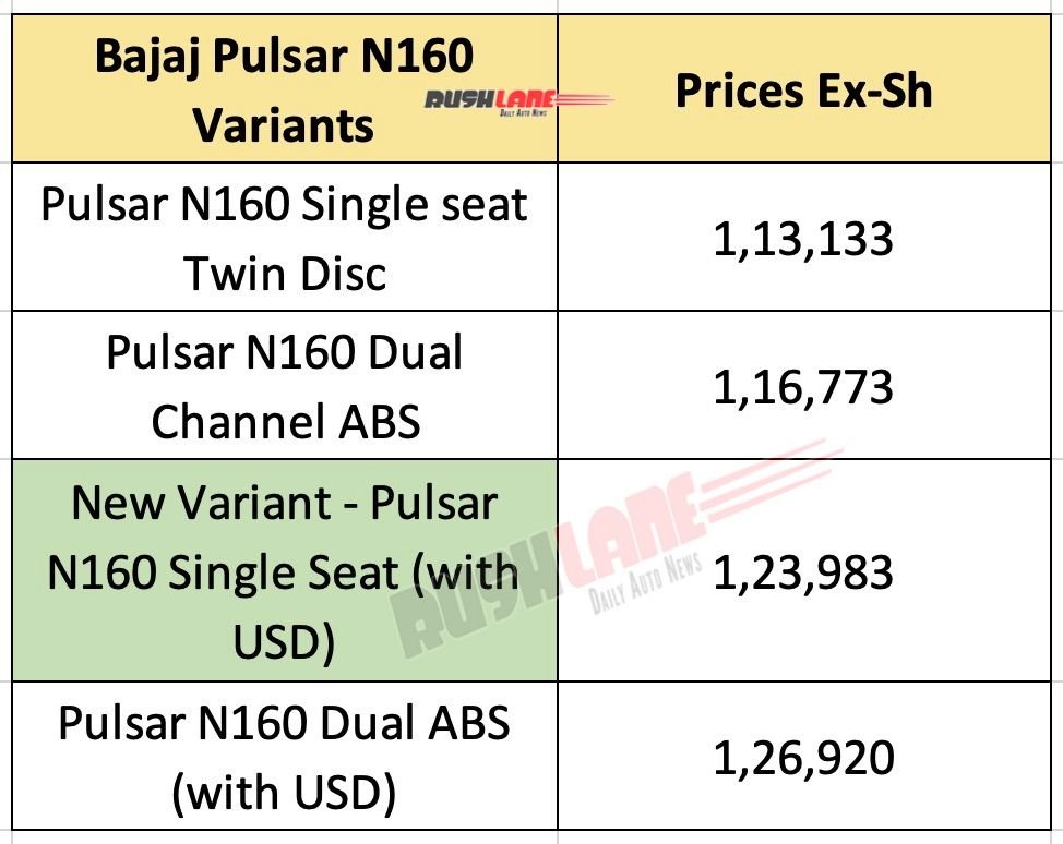 The Pulsar N160 range now consists of four variants, positioned to cater to different types of buyers. The entry point remains the single-seat twin-disc version priced at Rs 1,13,133, followed by the dual-channel ABS variant at Rs 1,16,773. The newly launched single-seat USD fork variant slots above these at Rs 1,23,983, while the top-spec dual ABS variant with USD forks is priced at Rs 1,26,920.